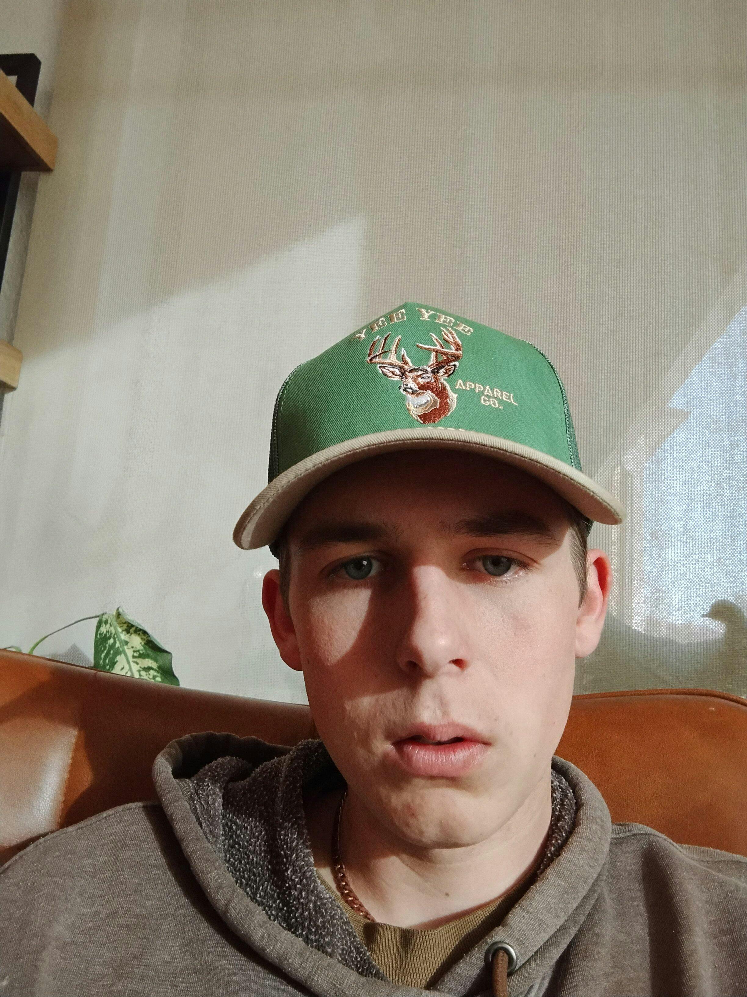 A trophy whitetail on a kelly green hat you'd find in Dad's closet.