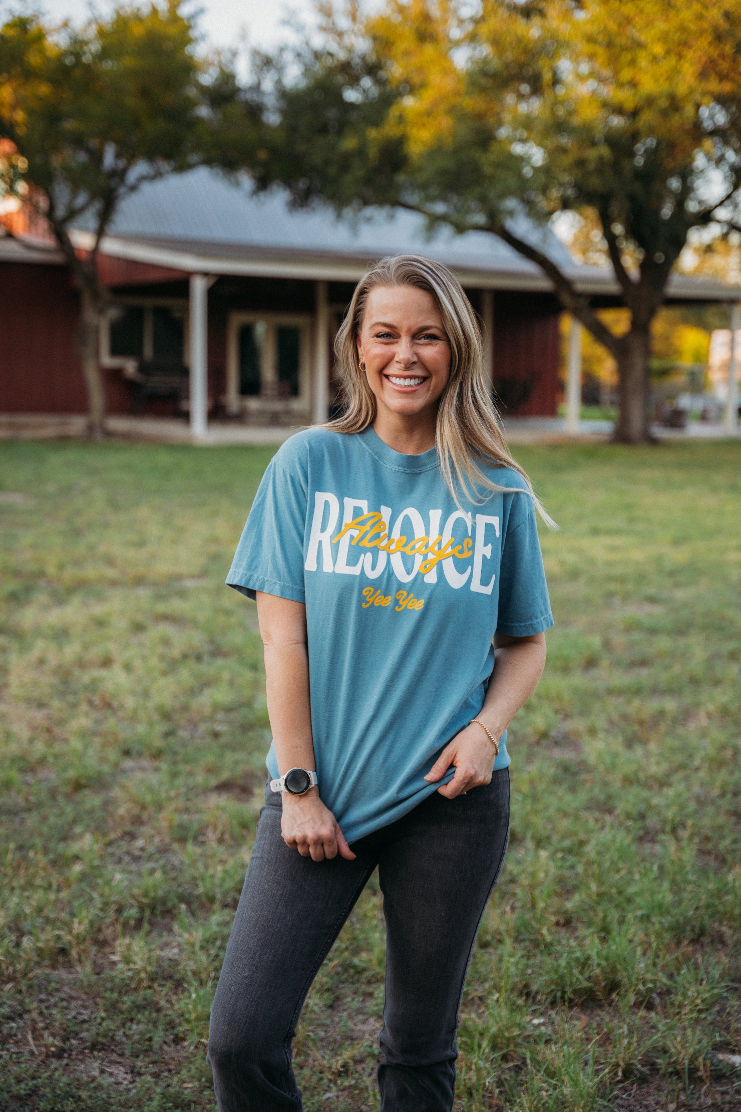 TACOMA L. (Lumberton, NC, US) REJOICE TEE WAS FOR MY WIFE. WE LOVE THE LORD AND WE LOVE THE SHIRT. NICE MATERIAL, NICE COLOR