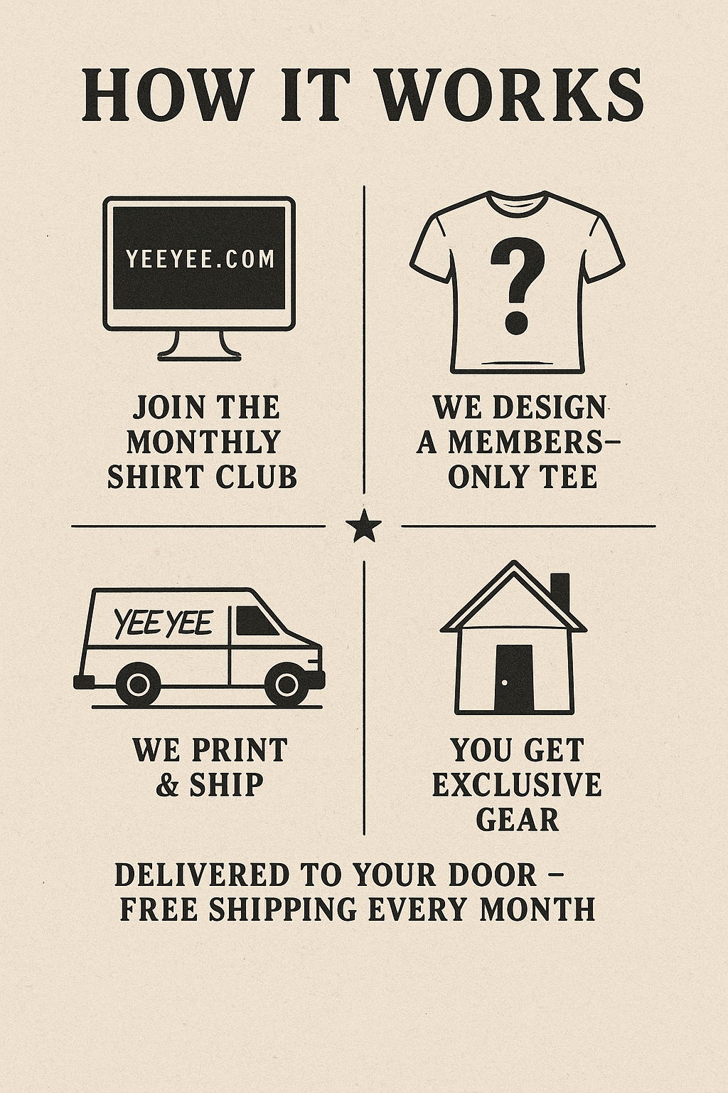 By becoming a Yee Yee Shirt of The Month Club member, you'll get an exclusive Yee Yee shirt delivered to your door with FREE shipping every month.